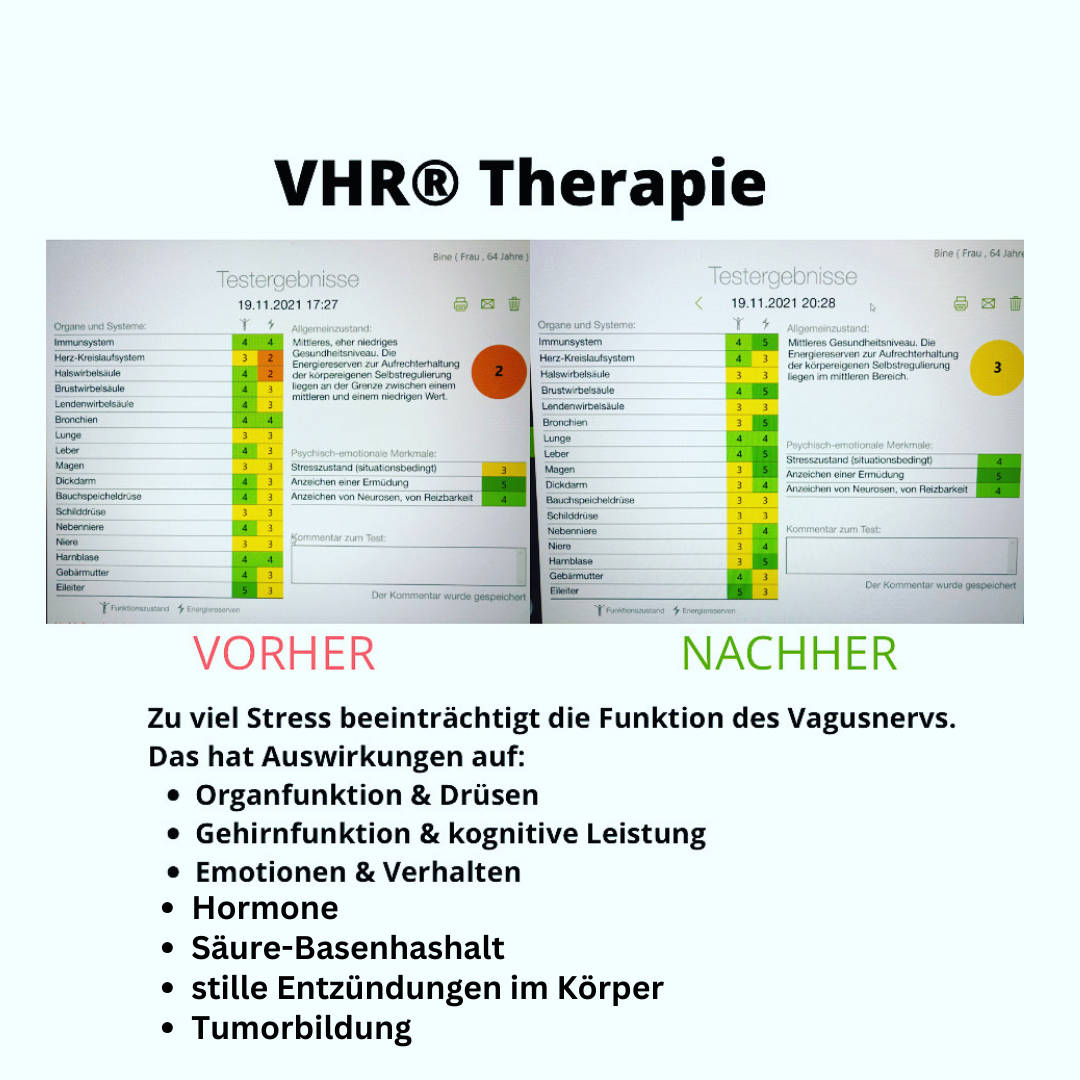 Stell dir vor, du könntest genau dort ansetzen, wo bisher Ratlosigkeit herrschte. Die VHR® Vagus Therapie ist eine von Evelyn Venzke entwickelte, bahnbrechende Methode, die darauf abzielt, den Vagusnerv gezielt zu aktivieren und den Parasympathikus wieder in sein Gleichgewicht zu bringen. Es geht darum, dem Nervensystem zu zeigen, wie es sich selbst wieder beruhigen kann. Eine Fähigkeit, die viele Patienten, welche lange mit Vagusdysfunktion leben, verlernt haben.